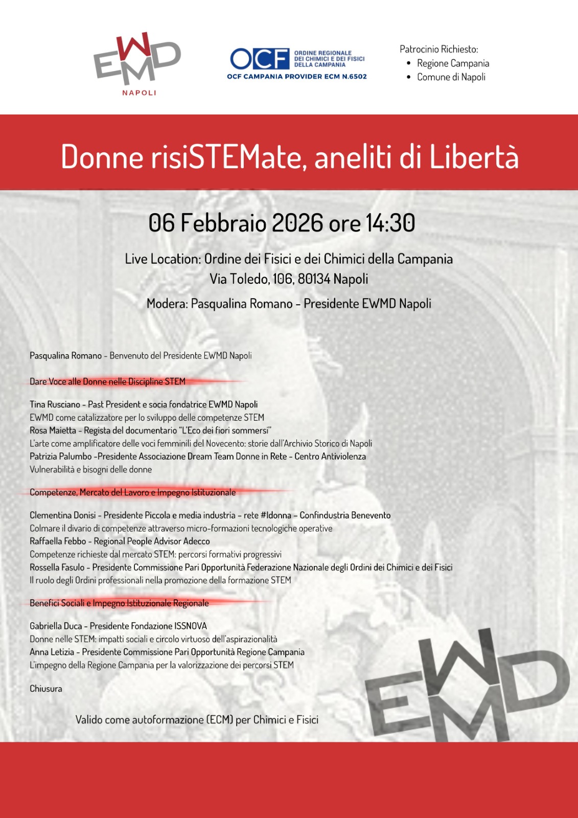 Il 6 febbraio 2026, alle ore 14.30, presso la sede dell’Ordine dei Fisici e dei Chimici della Campania in Via Toledo 106 a Napoli, si terrà l’incontro “Donne risiSTEMate, aneliti di Libertà”, promosso da EWMD Napoli in collaborazione con l’Ordine regionale dei Fisici e dei Chimici. L’iniziativa si inserisce nel quadro delle azioni per la Giornata internazionale delle donne e delle ragazze nella scienza e intende ribadire che una solida formazione nelle discipline STEM (Scienza, Tecnologia, Ingegneria e Matematica) è uno strumento decisivo per l’emancipazione femminile.